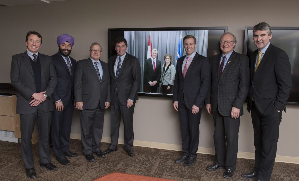 De gauche à droite: L’honorable Scott Brison; l’honorable Navdeep Bains; l’honorable Lawrence MacAulay; l’honorable Dominic LeBlanc; le Premier ministre Dwight Ball (T.-N.-L.); l’honorable Judy Foote; le Premier ministre Brian Gallant (N.-B.); le Premier ministre Wade MacLauchlan (Î.-P.-É.); le Premier ministre Stephen McNeil (N.-É.)